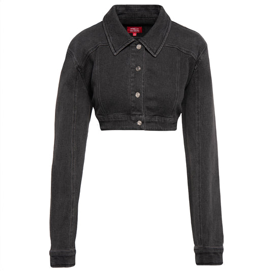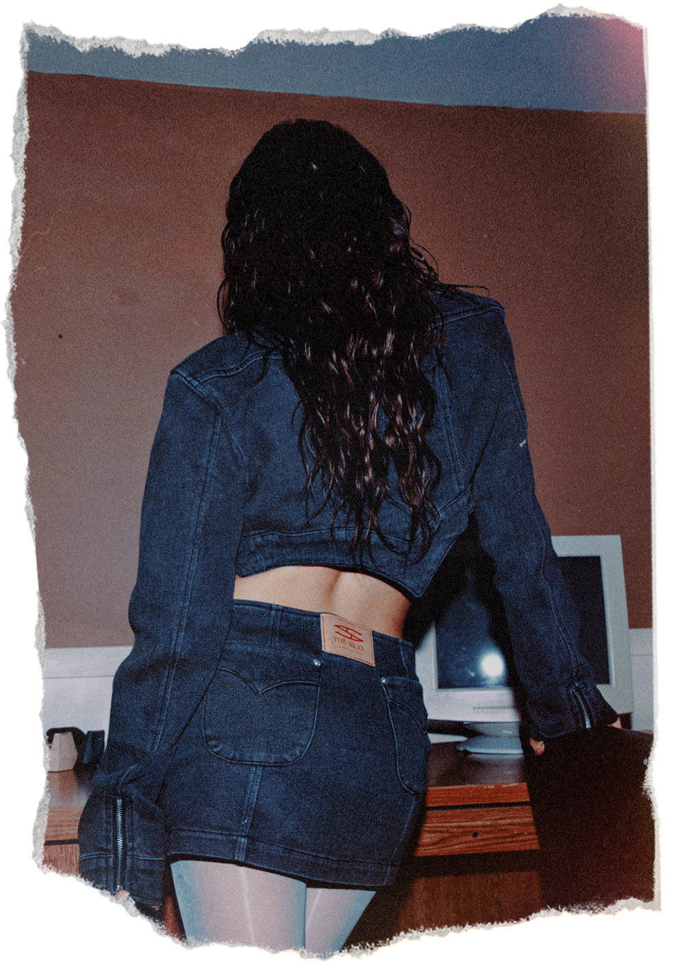 This denim set will make you look and feel like a sexy horror villain. Our Cathy Jacket is cropped with our signature pointed back, branded buttons and zippers at the cuff, pair it with our Cathy Skirt, mini length with a front scooped waistband that shapes the body so good, no killer can resist!