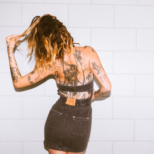 This denim set will make you look and feel like a sexy horror villain. Our Cathy Jacket is cropped with our signature pointed back, branded buttons and zippers at the cuff, pair it with our Cathy Skirt, mini length with a front scooped waistband that shapes the body so good, no killer can resist!