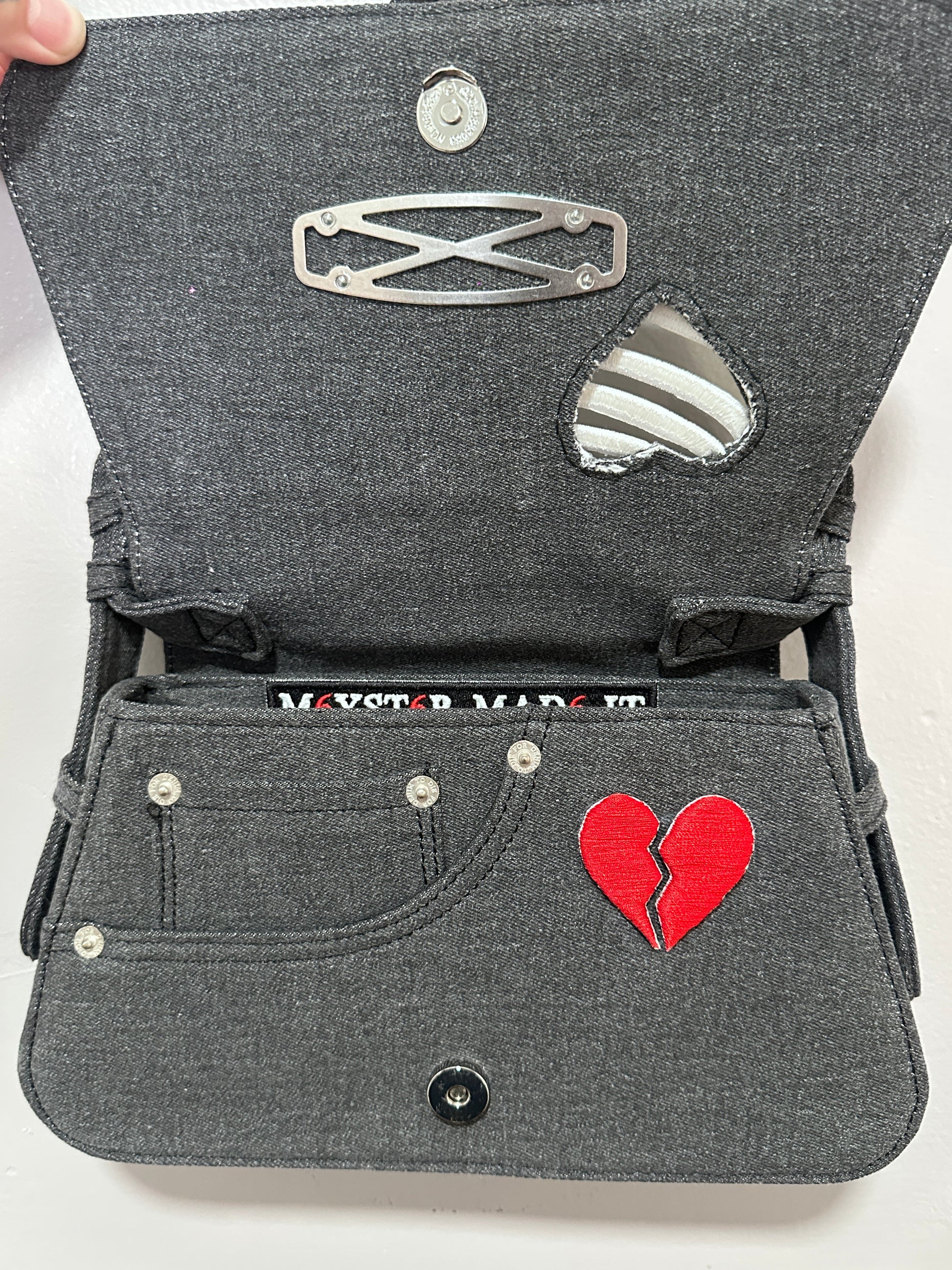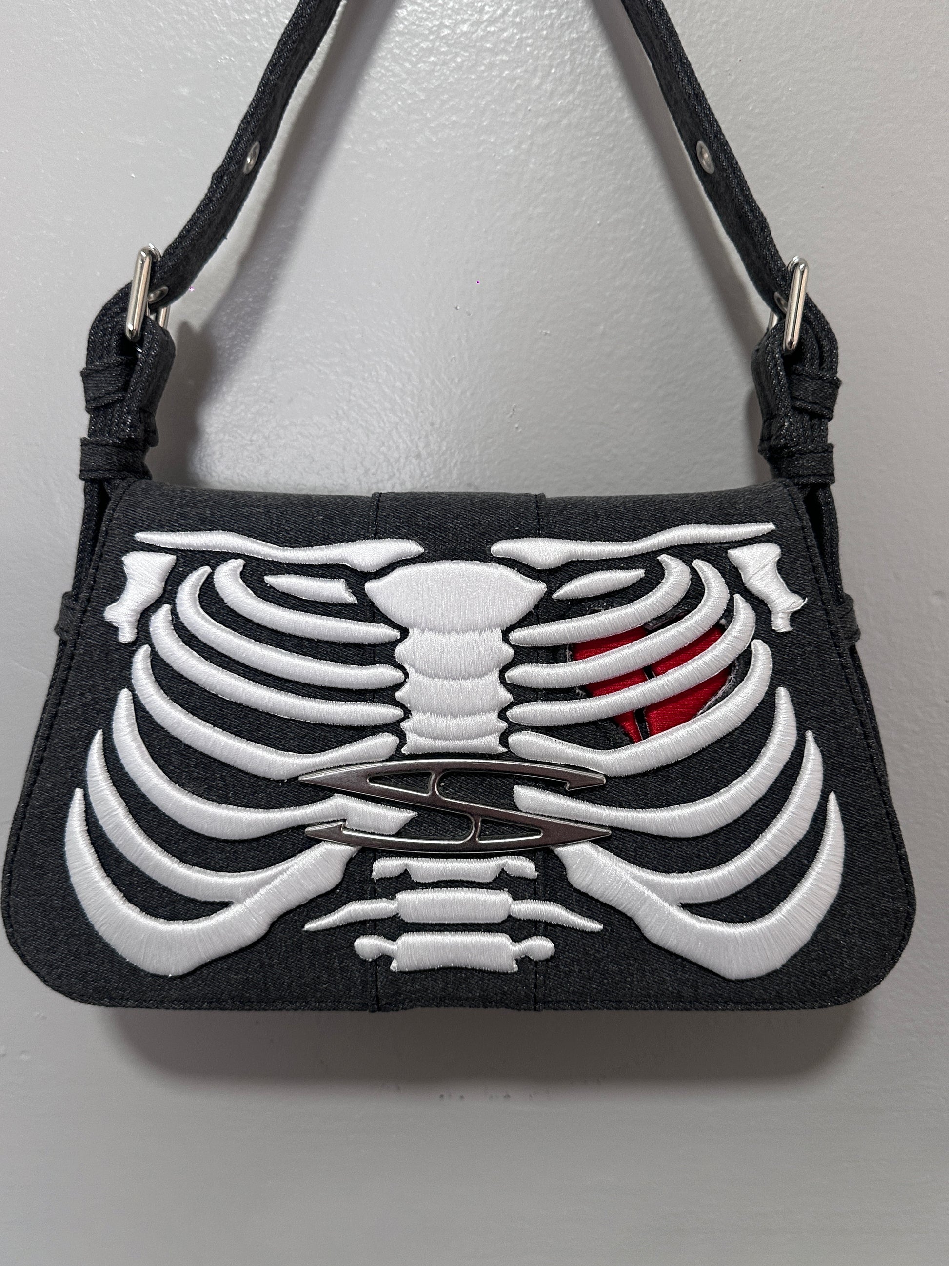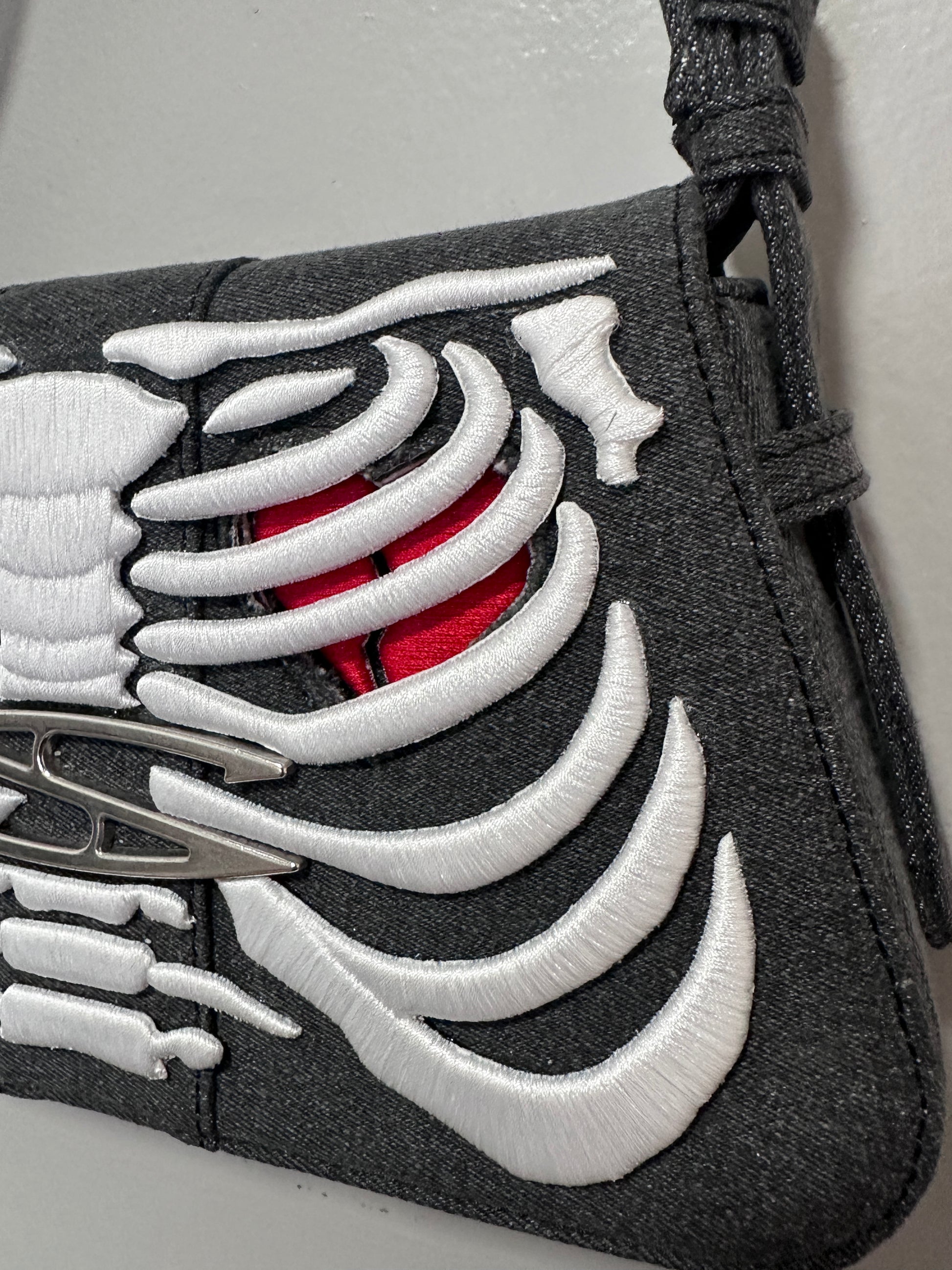 This bag is decorated with 3D Rib Cage Embroidery & has a heart-shaped cut out to reveal an embroidered 3D broken heart.