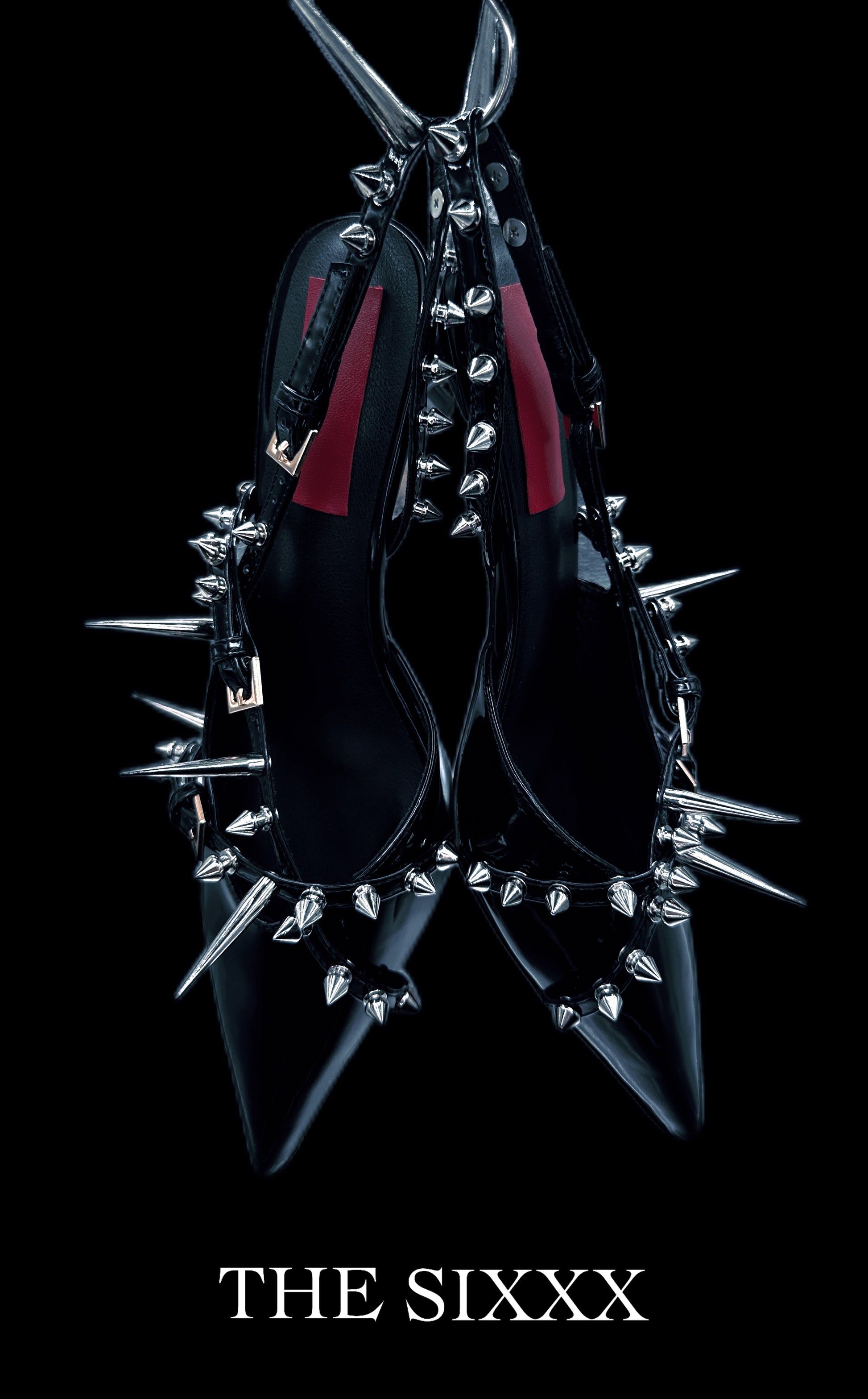 Strappy shiny black heels hand embellished with metal spikes, for those who love danger. Wear with Caution!